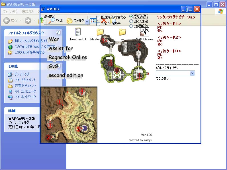 やっぱりサイズが大きくて邪魔だと言う話があったので、カスタマイズできるようにしました。ウィンドウもまとめてたのを分離して3つにしました。それぞれMAPとリンクフラッグとギルマス表示兼操作パネル。