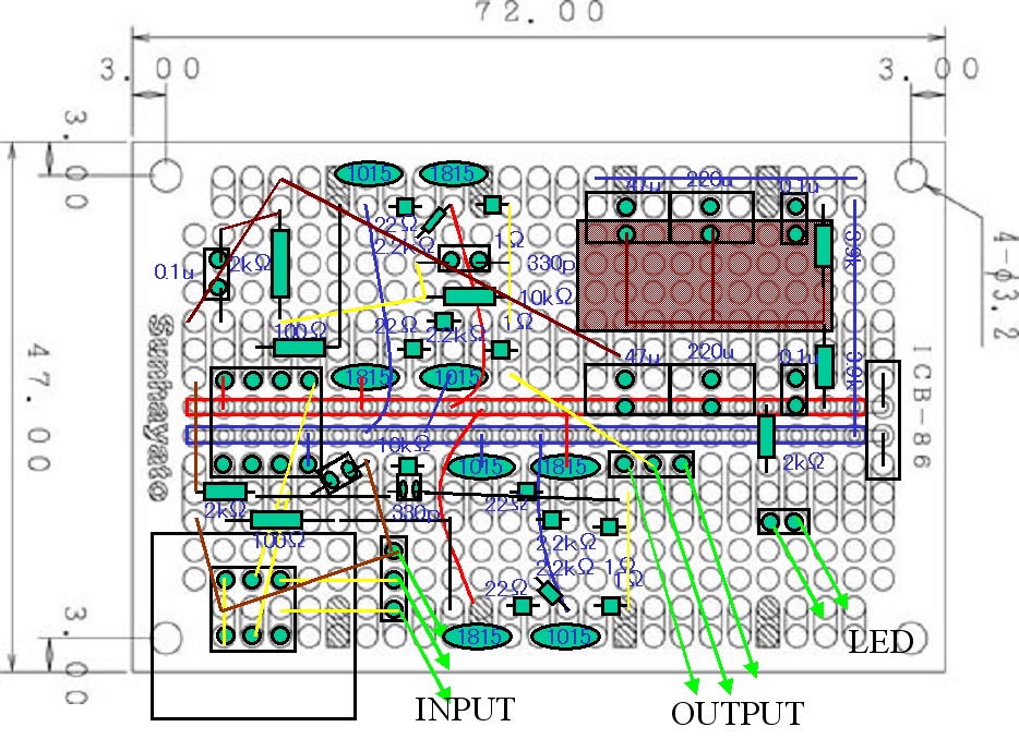 んでもってインプットジャックを隙間があるほうにして、ボリュームと間空けて、アウトプットジャックを基板上で回路がないところ飛び出せる様にしました。