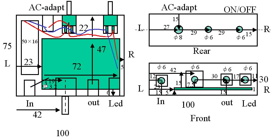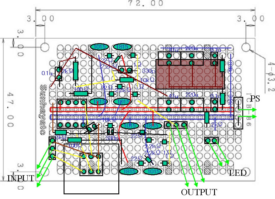 前の配置図だと、ただでさえボリュームの関係でパネルに密着させるので、トランジスタがじゃまでジャック関係がさせないということに気づきました。あとボリュームの直近にジャックが来るようになってたので、まぁボリュームまわすのに邪魔だと。