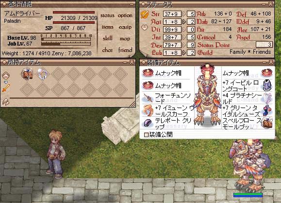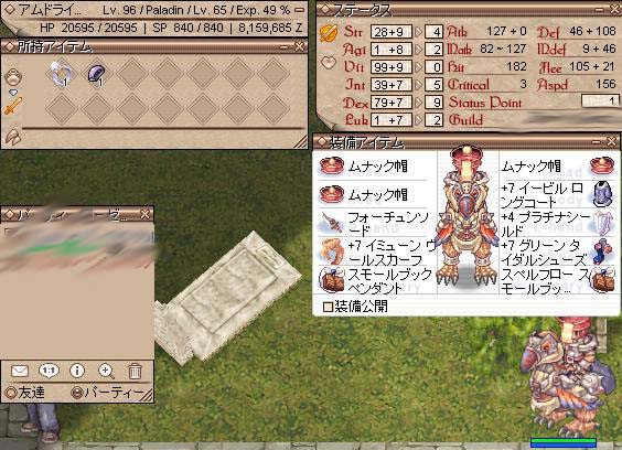 なんだかんだで名無しを謳歌できるくらいになりました。というかフォーチュン持ってから自信がついたというか。AGと完全回避で多少装備がやわくともダメージ量は結構減るので。ただSBPとムナックに何も挿してないのは多少罪かなとおもったりおもわなかったり。
