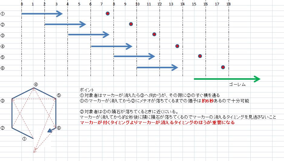 スタート地点(ゴーレムのいちで変わる)から最初のマーカーが見えたら対象者以外は歩き出す。2秒間隔のマクロを鳴らして、2秒毎に六角形の角を通過する。自分にマーカーがつかない限りはこの2秒毎の通過チェックで「誰にマーカーがつこうと、2連マーカーも気にせず」回避できる。