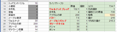 左の方に素材の店売り原価(灰)や変動する素材(白)をいれて書き換えれば計算値が変わります。