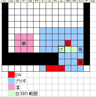 SWは上図の赤セルです。自分と外支援に3つくらい。マガレ回避用においときます。マガレ抱えてSWなくなったときは補充してあげるように。あと白羽の足元にもおいときます。