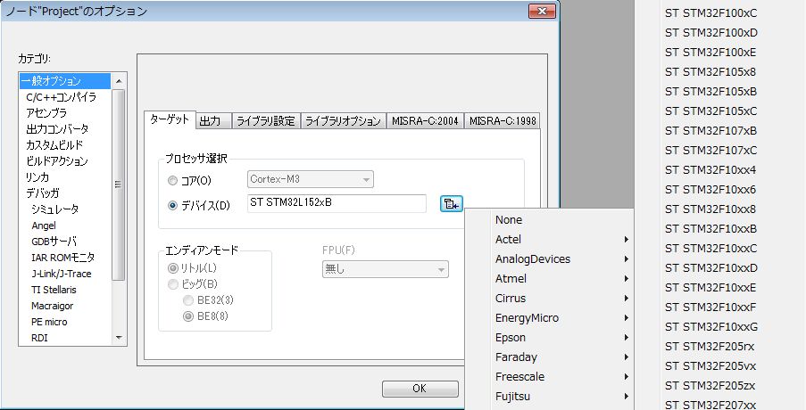 左の[一般オプション]のターゲットの[プロセッサ選択]が[デバイス]側になっていて