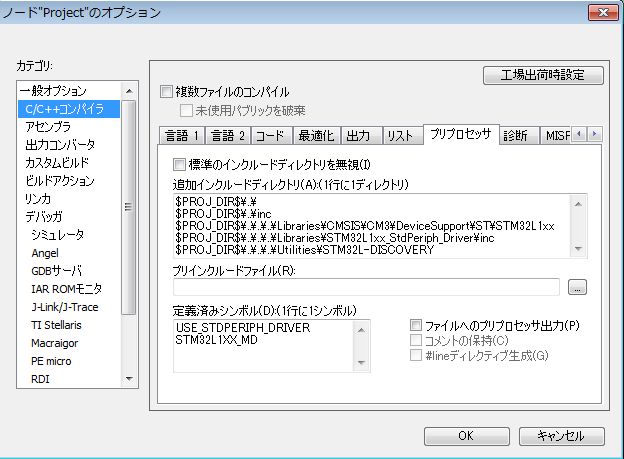 [プリプロセッサ]タブを選択して、インクルードディレクトリに色々入っているのを確認します。