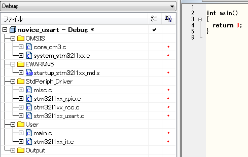 「novice_usart.eww」を作ります。③で作った.ewpと間違わないように注意