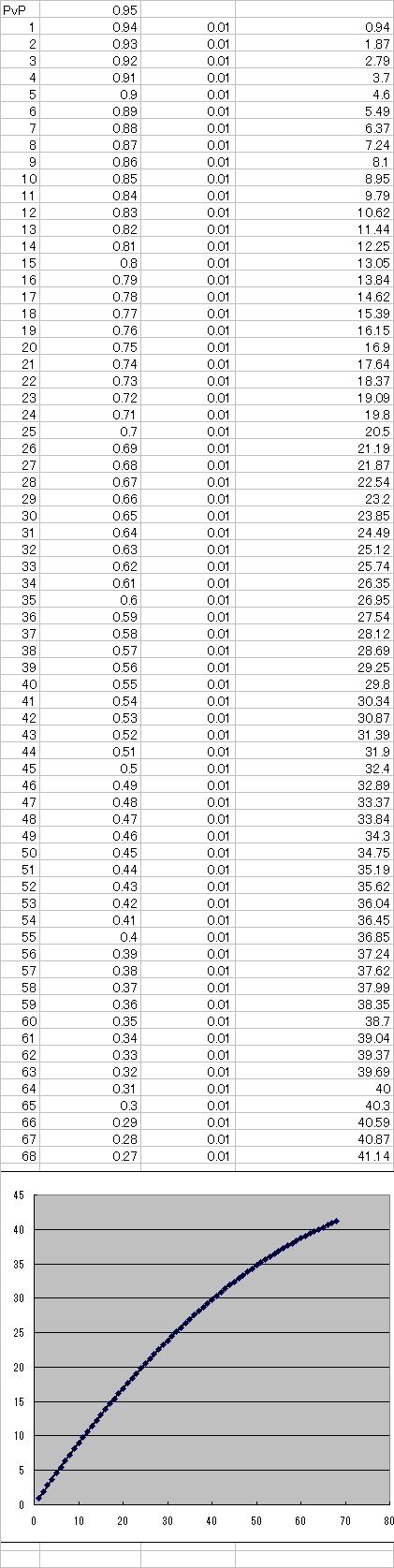 で、これのSUM値を取る(PvP攻撃力が2なら0.94+0.93ということ)